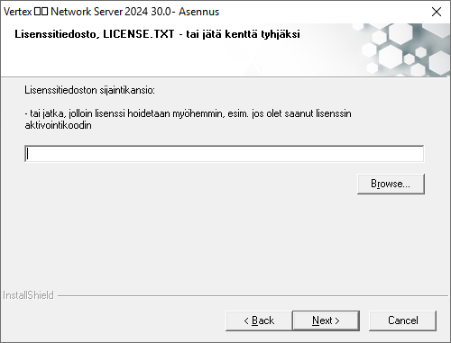 Voit myös ohittaa tämän kohdan ja kopioida LICENSE.TXT -tiedoston asennuksen jälkeen palvelimen vx[..]_srv/user -kansioon.