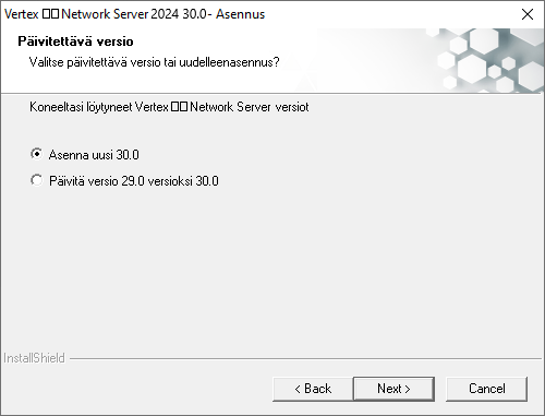 - Valitse Päivitä versio, jos haluat päivittää ohjelman edellisen pääversion uudeksi pääversioksi. Katso ohje Tiedostopalvelinasennuksen päivitys.