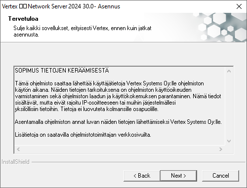 Ohjelma lähettää käyttäjätietoja Vertex Systems Oy:lle käytön aikana.