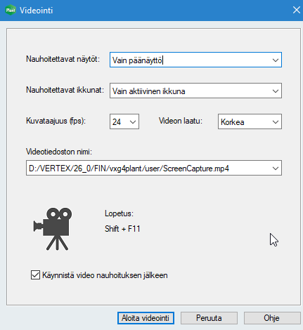 Toiminto Vie videoksi on uudistettu. Toiminto toimii nyt omassa säikeessään, mikä nopeuttaa toimintoa ja mahdollistaa mm. muiden kuin Vertex-ohjelmistojen esittämisen videossa. (PLANT-3321)