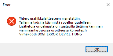 Vertex CAD 2021 (27.0) -versiosta lähtien 3D-grafiikan piirrossa käytetään Microsoft DirectX -ohjelmointirajapintaa. Riippuen mallin koosta ja näytönohjaimen suorituskyvystä, saatat joskus saada seuraavan virheilmoituksen: