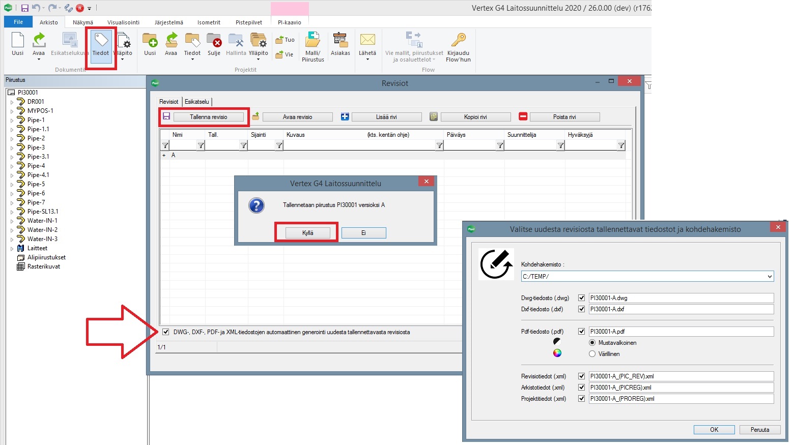 Uudesta piirustusrevisiosta tallennettavat valinnaiset tiedostot