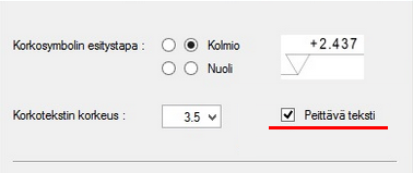 Voit halutessasi asettaa korkomerkin tekstin peittäväksi. Tämä parantaa tekstin näkyvyyttä, jos symboli sijoitetaan paikkaan, jossa on runsaasti viivageometriaa. (PLANT-1668)