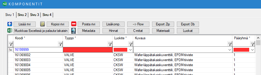 Lisättäessä uutta putkikomponenttia kirjastoon, ohjelma merkkaa pakolliset kentät punaisella. Tarkistus on päällä sekä uuden putkikomponentin tallennuksessa, että putkikomponenttitietokannan selauksessa. Selauksen aikana merkkaukset toimivat nopeussyistä vain kenttien muokkauksen yhteydessä. (PLANT-3332)