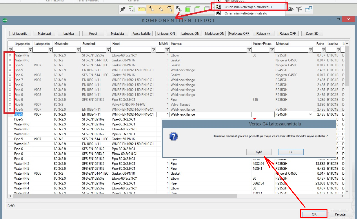 Poistettaessa rivejä Osien nimiketietojen muokkaus -toiminnon aikana, ohjelma tuo varmistuksen ja ilmoituksen siitä, että valittuja rivejä ollaan poistamassa mallista. (PLANT-3358)