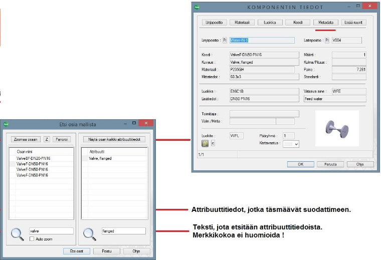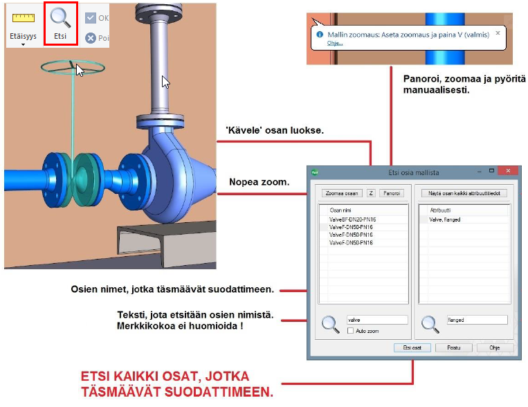 Uusi toiminto jolla voit etsiä auki olevasta kokoonpanosta osia nimen tai attribuuttitietojen perusteella. Annettujen hakutietojen perusteella ohjelma kerää listan löytyneistä osista. Osia voit:
