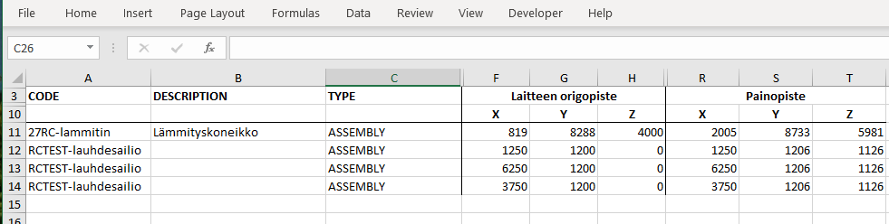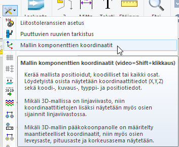 Usein halutaan listata mallista esimerkiksi siinä olevat laitteet ja laitteiden paikat laitoksessa (origopiste). Mallin komponenttien koordinaatit -toiminnolla on saatu listalle versiosta 27.0 lähtien alikoontien ja osien koordinaatit. Listalle tulostuvat nyt myös mallin painopisteen (painopistemakron) koordinaatit.