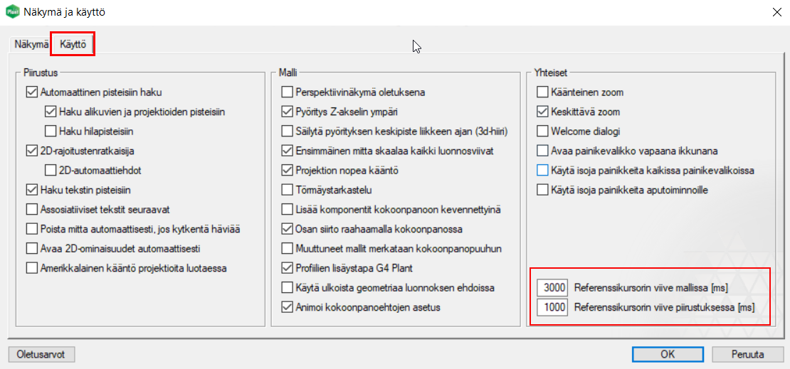 - Referenssikursorin viive piirustuksessa [ms] = 1000 (käytössä piirustuksissa ja mallien 2D/3D-luonnoksissa)